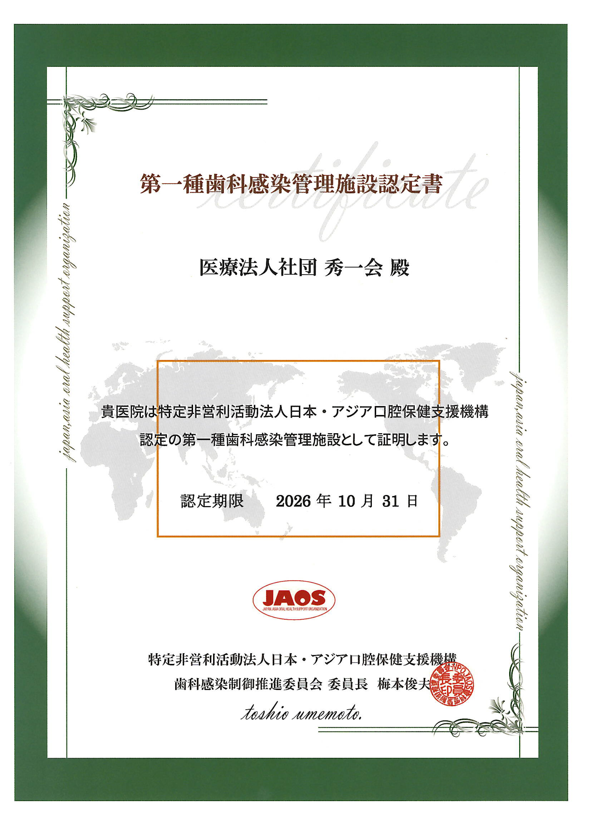 第一種歯科感染管理施設とは、感染管理に関する専門的な知識と技術を有し、それを実践できるスタッフが常駐している歯科医療機関として認定されるものです。この認定を受けている歯科医院は、茨城県内では2025年12月現在当院のみで、全国的にもまだ限られています。