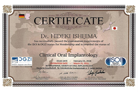 当院には、国際口腔インプラント学会認定医が在籍しております。国際口腔インプラント学会は、1972年設立の世界最大規模のインプラントに関する国際学術団体です。継続教育や学術活動を通じて、治療技術の向上と質の高い医療の普及を目的としており、国際口腔インプラント学会認定医は、同学会が定める基準を満たし、専門知識と十分な臨床経験を有すると認められた歯科医師に与えられる資格です。国際基準に基づく知識と豊富な臨床経験を活かし、安全性と確実性を重視したインプラント治療をご提供しています。